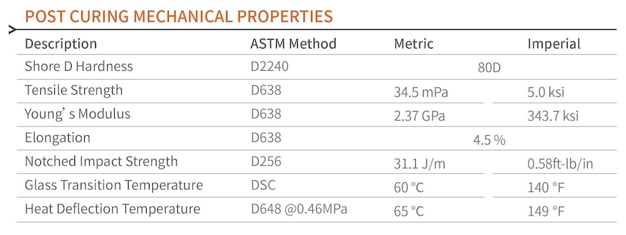 •  After post-curing, the molded parts exhibit excellent mechanical properties comparable to injection-molded plastic parts.