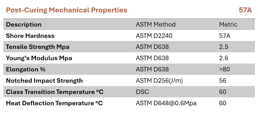 Flex 57A is a photopolymer resin for stereolithography that cures under a light source with a wavelength of 395–405 nm.