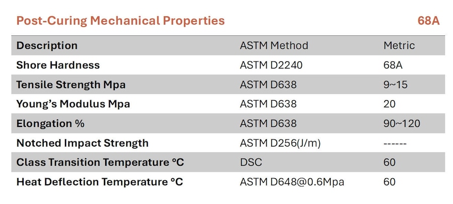 Flex 68A is a photopolymer resin for stereolithography that cures under a light source with a wavelength of 395–405 nm.